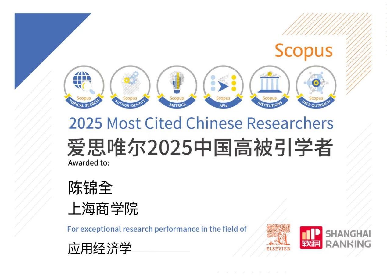 近日,全球知名学术出版机构爱思唯尔(Elsevier)正式发布2025年度“中国高被引学者”(Highly Cited Chinese Researchers)榜单。本次评选中,经济管理领域共有543所高等院校及科研机构的学者入选,其中应用经济学学科入选学者150名。我校特聘教授陈锦全凭借扎实的学术积累与突出的科研贡献,再次成功入选该榜单,反映出其在金融学科研究领域的学术影响力,也体现了我校在应用经济学研究领域的综合实力与发展潜力。