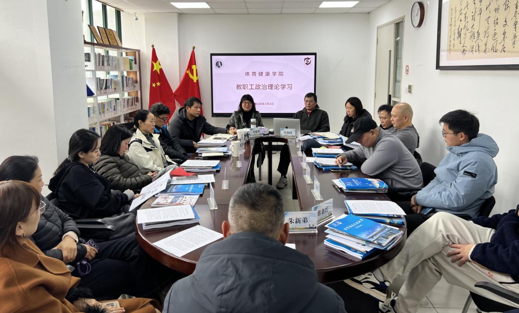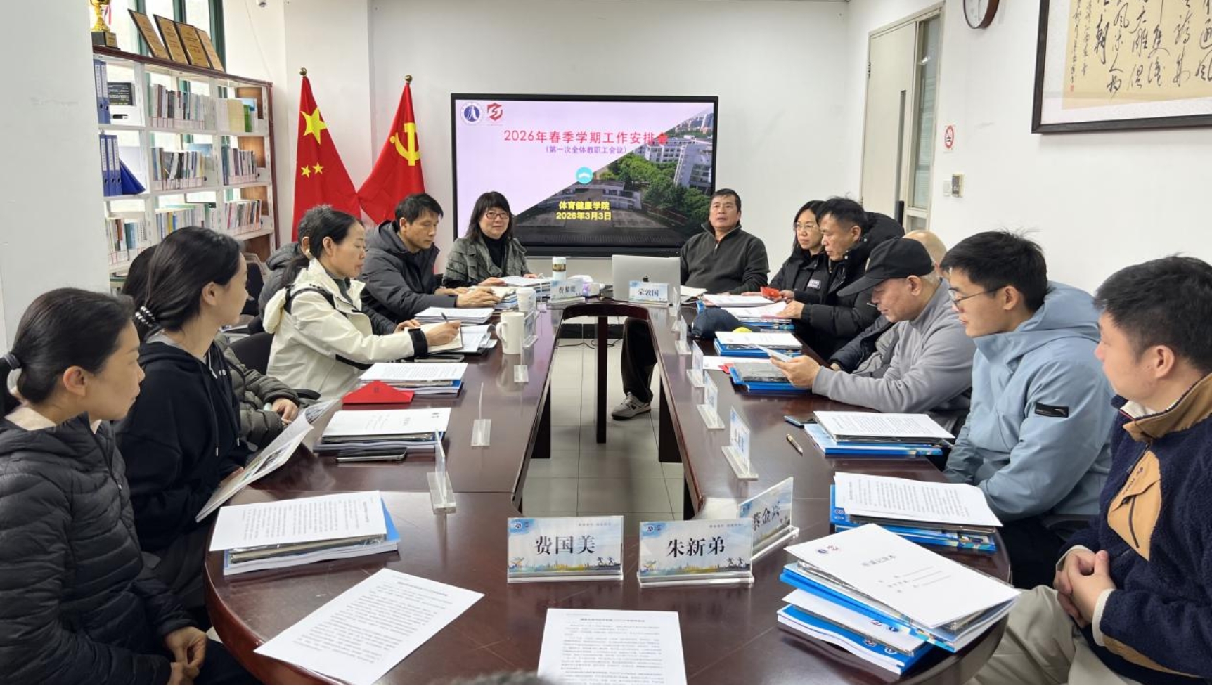 3月3日中午,体育健康学院2026年春季学期第一次全体教职工大会在行政楼219会议室召开。会议由学院党支部书记费黎艳主持,院长荣敦国全面总结回顾2025年工作成绩,深入分析当前形势与任务,系统部署新学期重点工作,副院长徐斌针对教学工作进行具体安排,费黎艳书记带领全体教职工进行政治理论学习,全体教职工参会。
