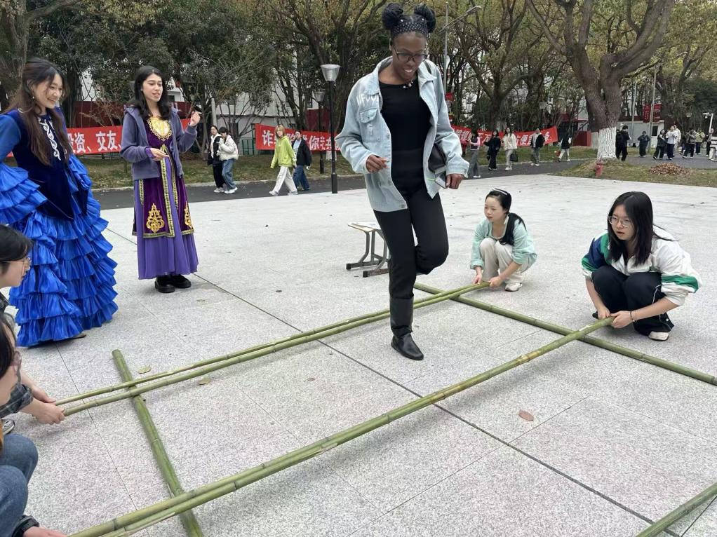 活动现场秩序井然、氛围热烈,各项目体验环节精彩纷呈。壮族背篓绣球项目中,同学们精准投掷、默契协作,生动传递民族风情与团队精神;黎族/瑶族跳竹竿环节,参赛人员踏着明快节奏轻盈跳跃,尽显传统民俗的韵律之美;踢毽子、投壶等单人挑战里,参赛同学凝神聚力、专注比拼,每一次精彩发挥都赢得现场阵阵喝彩;民族同心圆、重走长征路等团队项目中,同学们心往一处想、劲往一处使,在协作中凝聚集体力量,充分展现了新时代青年学子昂扬向上的精神风貌。