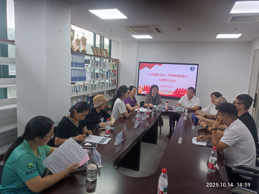 为深入贯彻落实学校本科教育教学审核评估工作要求,扎实推进第四届“师德师风建设月”专项活动,10月14日下午,体育健康学院党支部在行政楼221会议室组织开展“以评促教守初心,师德铸魂育新人”主题党日活动,推动教育教学审核评估工作与师德师风建设深度融合、同步部署、一体推进。会议由体育健康学院党支部书记费黎艳主持,院长荣敦国及全体教职工党员参加。