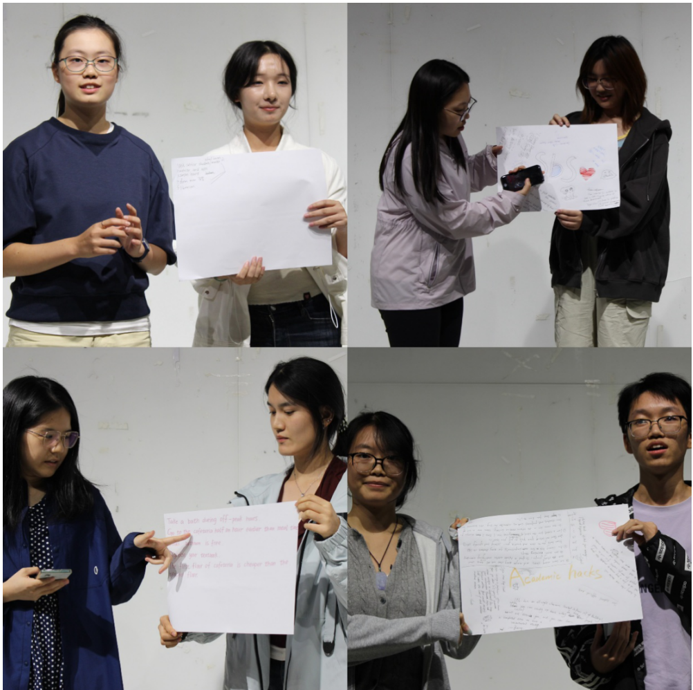 在英语角活动中,外教Judith先将在场同学分组,围绕大学生活开展小组讨论,随后分发纸张给每一小组。同学们把对上海商学院的认识写在纸上,图文并茂制作海报后,每一组上台介绍自己设计海报的理念,分享自己对大学生活的感受。之后外教评选出最优秀的小组,并分发礼物。