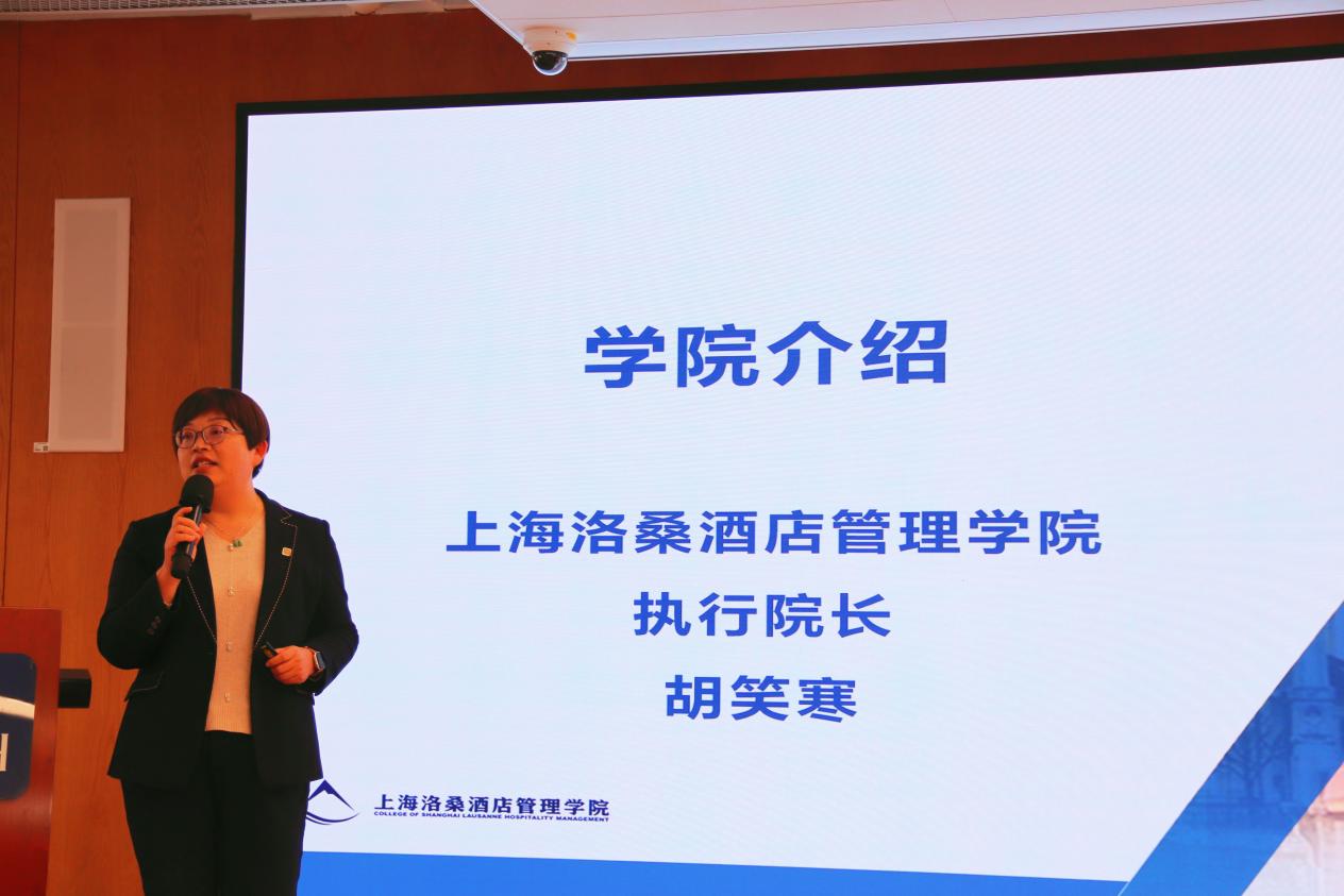 学院执行院长胡笑寒系统阐述了学院的办学全景。她从“中瑞实质合作”、“产教深度融合”、“数字科技赋能”三大特色维度,详细介绍了学院如何将EHL的"洛桑模式"进行本土化创新,构建"产学研用"深度融合的培养体系。胡笑寒重点展示了学院"五个一"国际化学生培养计划,即每个学生在四年学业中都能获得:海外游学交流交换、国际学术会议参与、国际活动志愿者经历、国际专业竞赛参与以及海外实习(随企出海)机会。这一创新性培养模式确保了学生100%拥有国际化经历,有效提升了学生的跨文化沟通能力与国际视野。