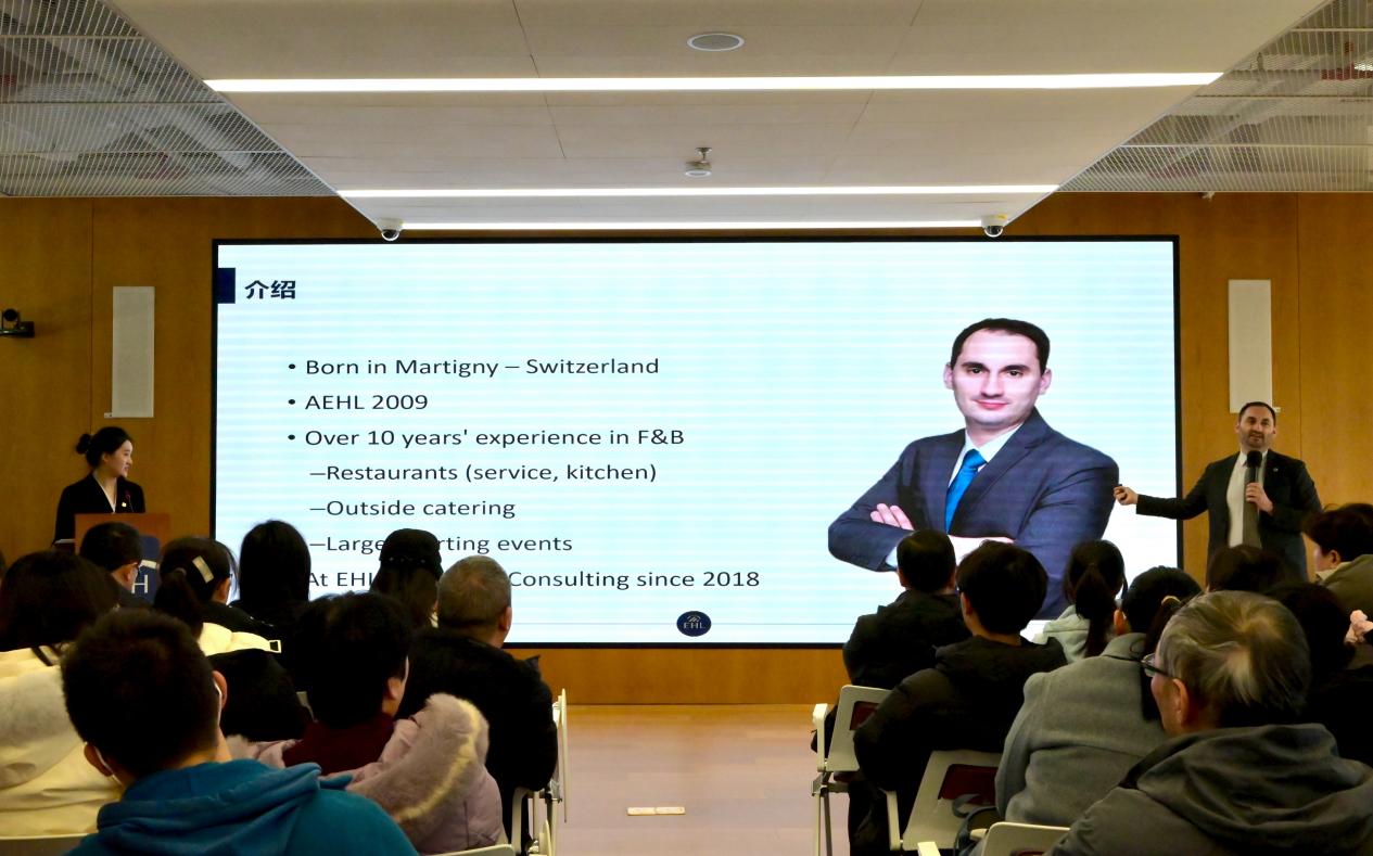 EHL集团咨询顾问Jean Baptiste还作了瑞士EHL洛桑酒店管理商学院基本情况及泛服务业的介绍。Jean Baptiste特别提到,学院毕业生就业去向多元,46%进入金融、咨询、奢侈品等非酒店领域,印证了“泛服务管理”人才培养的广泛适应性。