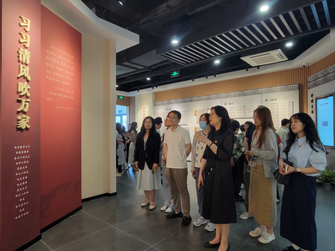 马院的党员同志们在正气馆内历代廉政名士与名人家风前讨论交流、驻足深思在学习馆内新颁布的《中国共产党纪律处分条例》增写和修改内容的展牌认真学习、内化于心;在警示内的十八大以来各级纪检监察机关办理的一个个典型案例反思初心坚定信念