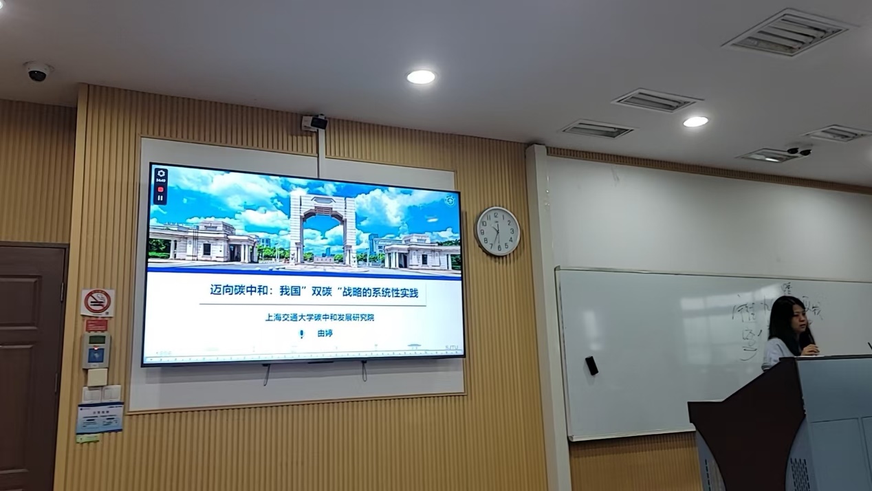来自上海交通大学碳中和发展研究院的由婷老师,她用详实的数据和大量的案例,从我国“双碳”战略提出、“双碳”政策体系、“双碳”推进进程以及“双碳”共性挑战四个方面进行了讲述。通过她的讲解,学生们对我国在应对气候变化、推动绿色发展的“双碳”战略举措有了更为清晰地认识,也对实现碳达峰、碳中和目标的重要性和紧迫性有了更深刻地理解。