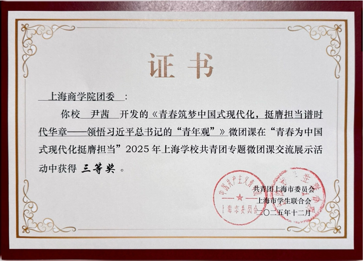 近日,由共青团上海市委员会、上海市学生联合会主办的2025年上海学校共青团专题微团课展示交流活动圆满落幕,活动吸引了全市高校及高中阶段学校的广大青年教师与学生积极参与。马克思主义学院青年教师、校团委挂职团干部尹茜申报的微团课作品《青春筑梦中国式现代化,挺膺担当谱时代华章——领悟习近平总书记的“青年观”》荣获三等奖,体现了我院青年教师扎实的理论素养与出色的教学风采。