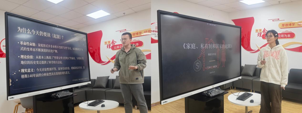 本次读书活动精选马克思主义经典著作《家庭、私有制和国家的起源》,搭配文学经典《玩偶之家》作为拓展书目展开研读。围绕经典,两位学生代表尹宗路、聂新雨先后做主题分享。尹宗路同学系统梳理恩格斯著作的创作背景与核心观点,阐释家庭形式的历史演进,揭示私有制与性别不平等的内在关联,结合现实解读家务劳动价值与女性发展的时代意义。聂新雨同学从理论与文学双重视角,对比剖析两部经典,阐明女性解放的根本路径在于经济独立与公共劳动,解读娜拉觉醒所彰显的人格独立精神,引发在场同学深刻共鸣。常乐乐、胡逸歆、徐柯怡、张文馨等同学踊跃交流,分享学习感悟,凝聚思想共识。