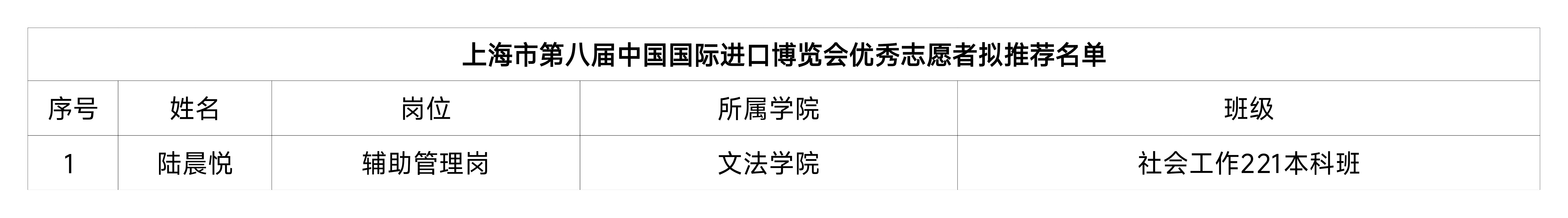 在已评选出的12位第八届进博会校级优秀志愿者中,经自愿报名、师生代表打分、校团委终审,拟推荐第八届中国国际进口博览会上海市优秀志愿者1名。现将结果公示如下: