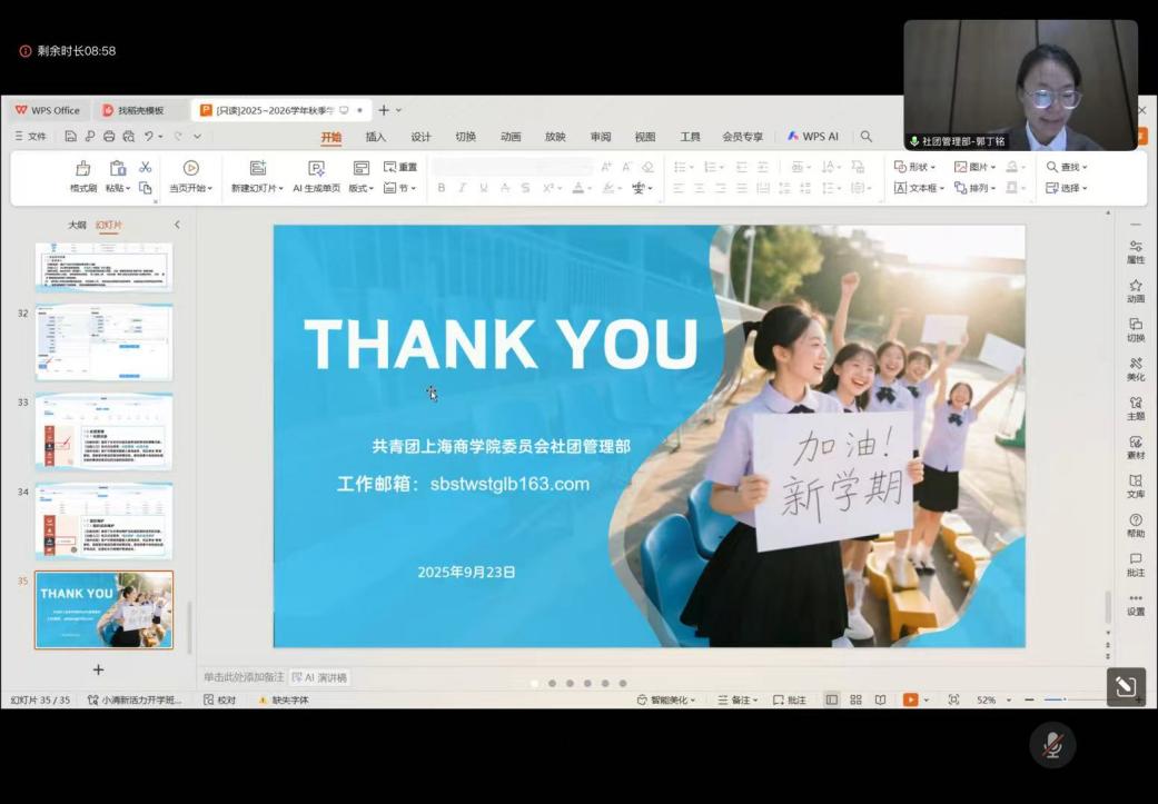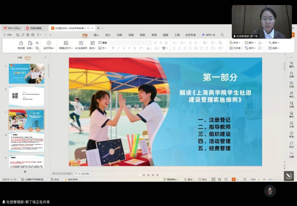 新学期伊始,为规范学生社团管理、赋能社团活动高效开展,共青团上海商学院委员会社团管理部在线上顺利举办2025-2026学年秋季学期“社团学校”培训。会议由校团委社团管理部副部长郭丁鸣主持,社团管理部全体成员及各学生社团主要负责人参会。