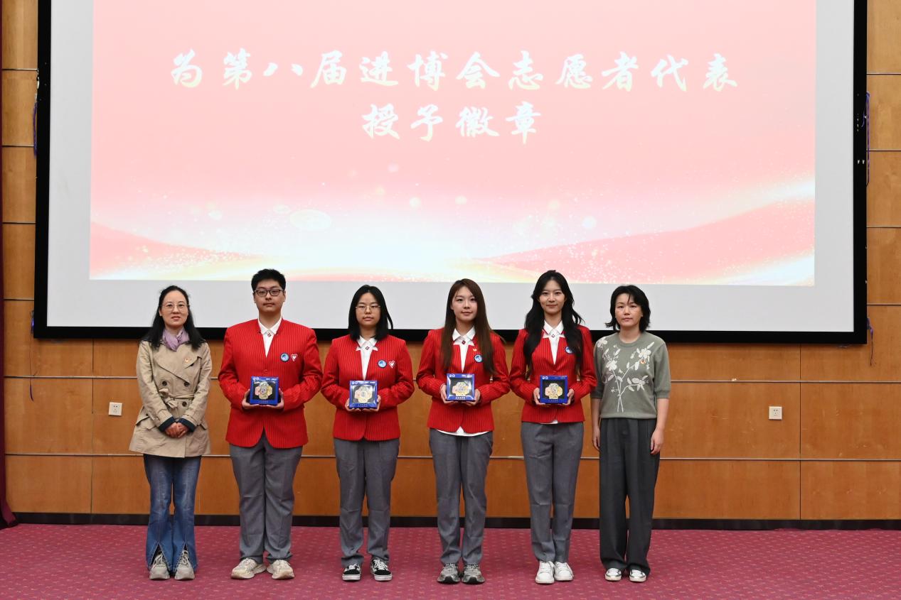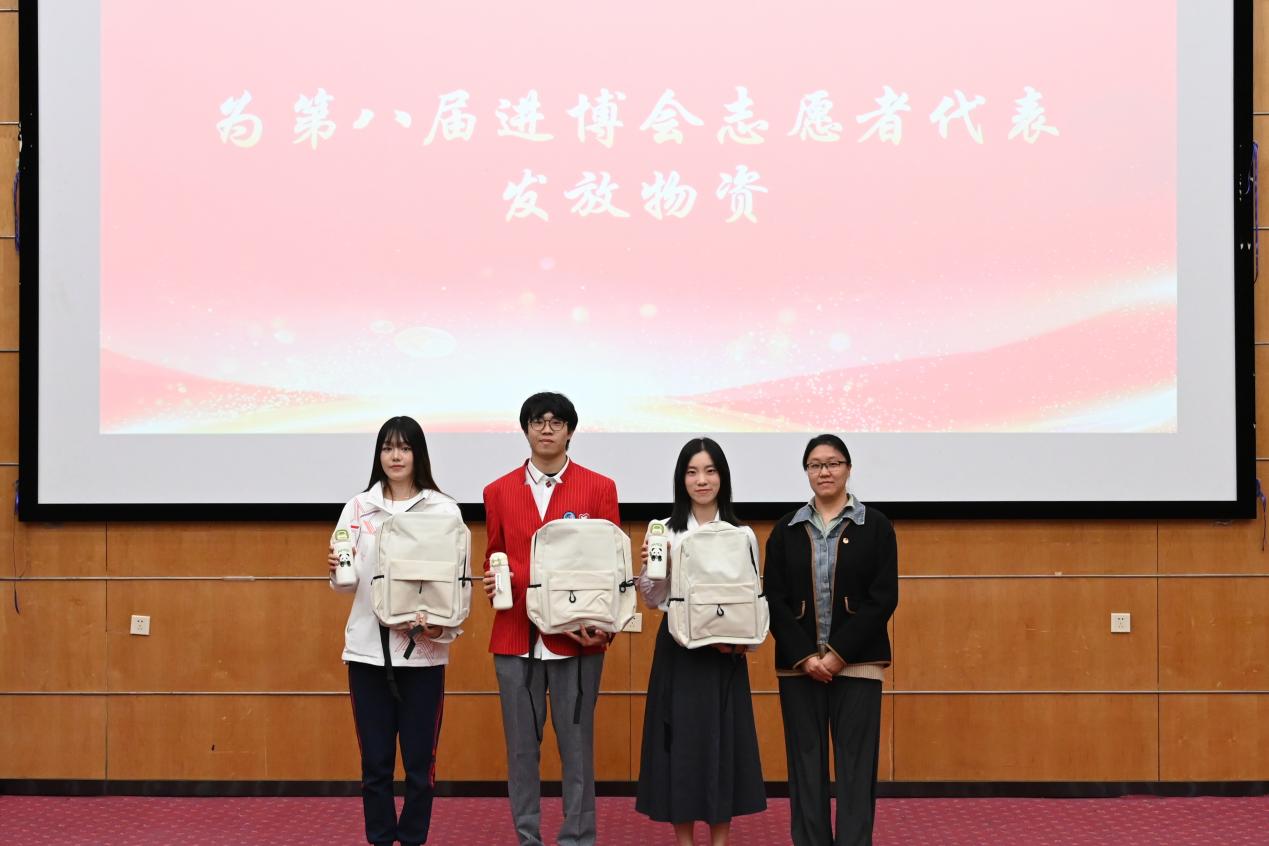 暖心关怀,坚实保障。党委学工部部长李爽为第八届进博会志愿者代表授旗,将服务进博的使命与责任郑重交付。党委研究生工作部副部长王韦达与教务处副处长倪琳共同为志愿者代表授予徽章,勉励他们亮明身份、担当作为。后勤保障处副处长孙旭东为志愿者代表发放保障物资,以周到细致的后勤服务,为“小叶子”的进博之旅保驾护航,成为他们最温暖、最坚实的后盾。