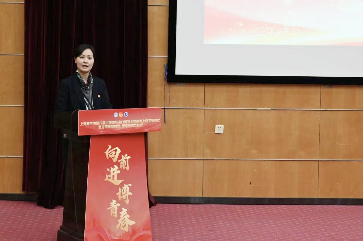 图为党委组织部副部长许平宣读《关于成立上海商学院第八届进博会志愿者临时党、团组织的决定》