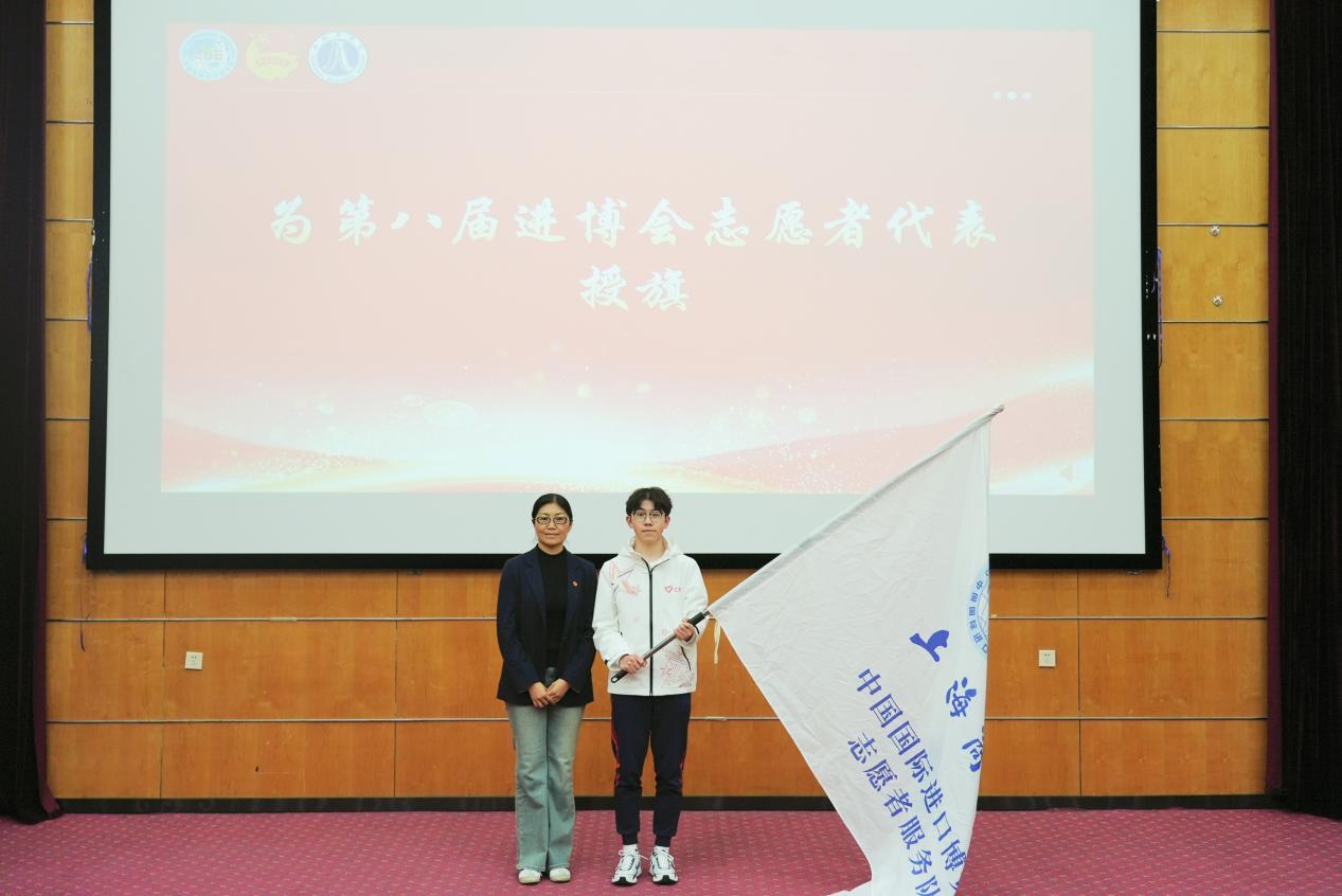 图为党委学工部部长李爽为第八届进博会志愿者代表授旗