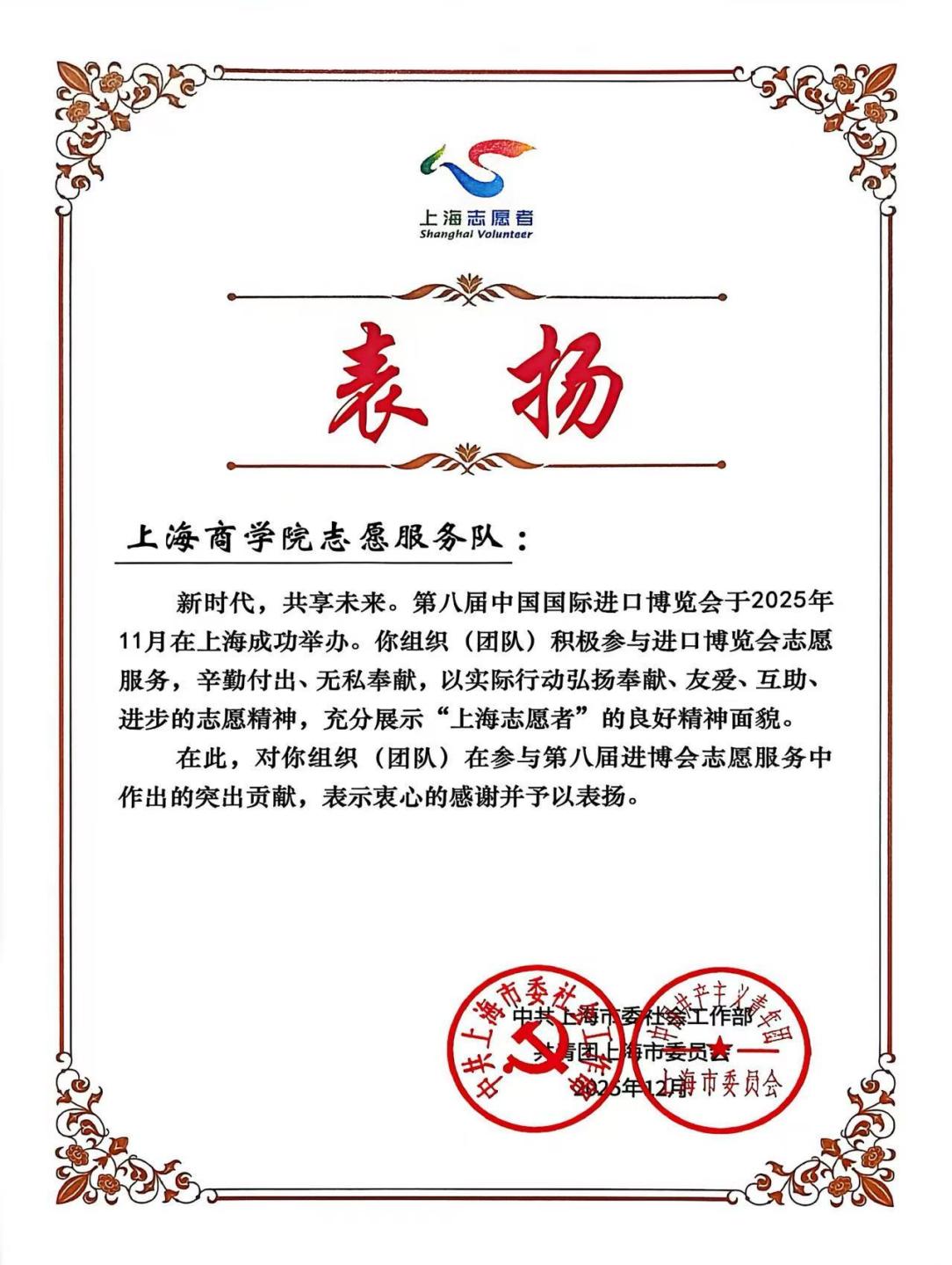 近日,第八届中国国际进口博览会志愿服务表彰结果公布,上海商学院志愿服务队获评第八届中国国际进口博览会志愿服务先进集体,我校陆晨悦同学获评上海市优秀志愿者,充分彰显了上商青年的责任担当与学校志愿服务工作的扎实成效。
