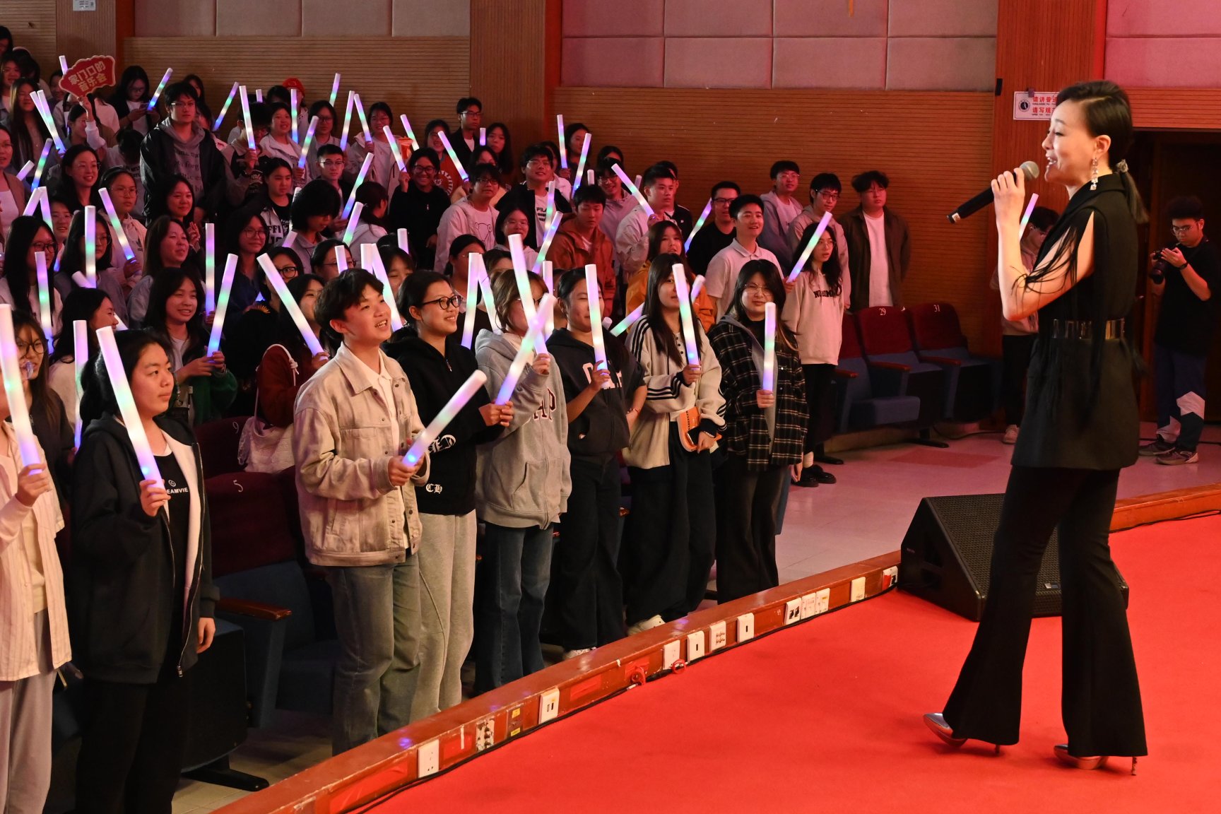 男声独唱《红旗飘飘》用热情激昂的演唱,将对五星红旗的敬仰、对祖国的热爱融入其中,旋律响起便让人热血沸腾,激发强烈的民族自豪感;女声独唱《我爱你中国》,深情而大气的演唱,从山河壮丽到人民奋进,全方位展现了对祖国的无限热爱,歌声中满含深情与骄傲,极具感染力;女声独唱《灯火里的中国》用温暖而明亮的歌声,描绘出新时代中国的繁华与安宁,从城市灯火到乡村烟火,展现出国家发展的美好图景与人民的幸福生活。男声独唱《强军战歌》,铿锵有力、气势恢宏的演唱,展现出中国军人的威武英姿与强军报国的坚定信念,传递出捍卫国家主权与领土完整的决心。多位演唱家唱至深情处,走向观众席中与师生互动,全场观众时而起立合唱,时而与歌唱家握手,时而互动演唱,知识的种子悄然播撒,家国情怀的接力棒在融洽的氛围中传递。