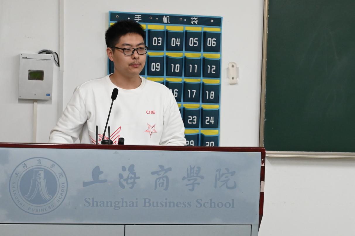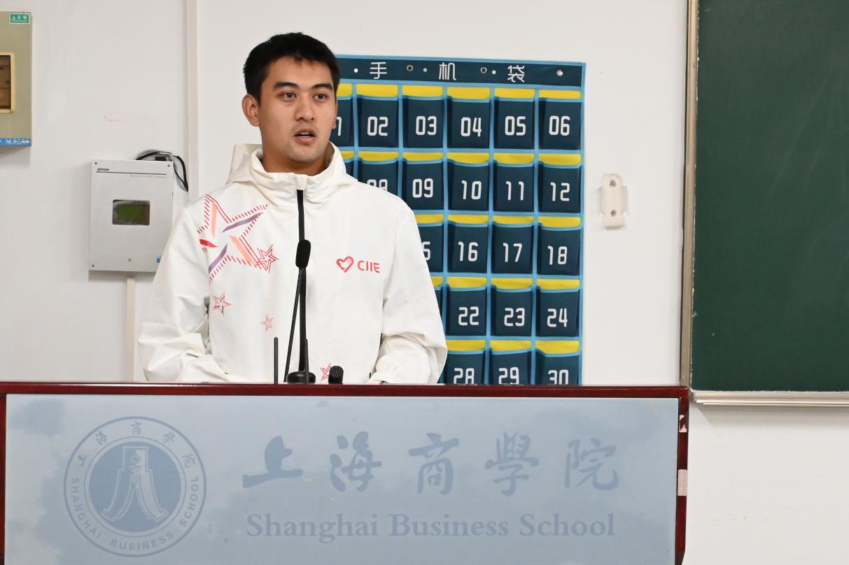 图为第八届中国国际进口博览会上海商学院领队陆晨悦介绍培训要求