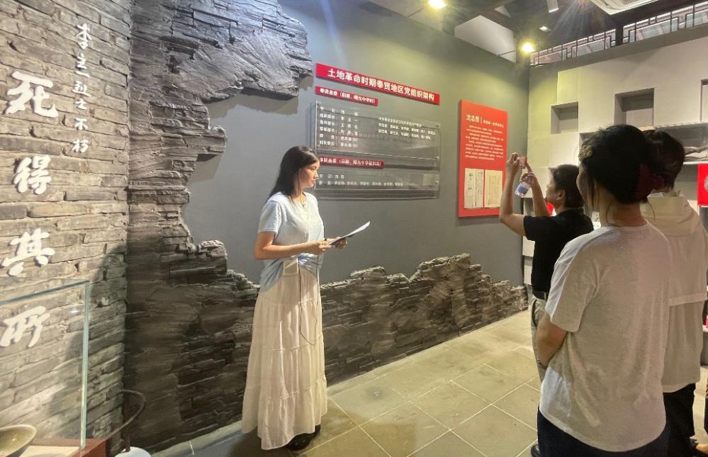 中共奉贤县委旧址是奉贤境内第一个中国共产党组织的诞生地,更是无数革命先辈们抛头颅、洒热血的红色圣地。展示馆围绕“信仰、忠诚、奋斗”这一主题,生动讲述了从第一次国内革命战争时期到土地革命时期,从抗日战争到解放战争时期,奉贤党史上的重要人物和事件。在入党积极分子沈欣冉的讲解中,大家了解了中共奉贤县委的成立背景、革命历程,以及奉贤地区共产党人带领群众开展武装斗争、抗日救亡的英勇事迹。