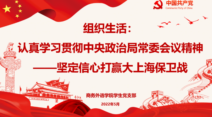 商务外语学院学生党支部于5月20日召开线上组织生活,深入学习贯彻落实习近平总书记重要讲话和指示批示精神,坚定信心打赢大上海保卫战。学院党总支副书记孙旭东、党总支组织员胡安华、学生党支部书记杨悦及全体学生党员参加会议。会议由支部书记杨悦主持。