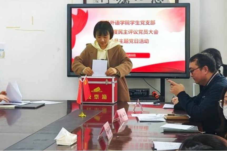 为深入学习贯彻习近平新时代中国特色社会主义思想,完善党员民主评议机制,做好党员队伍建设工作,充分发挥党员先锋模范作用,商务外语学院学生党支部于3月22日下午在行政楼407会议室召开支部民主评议会暨主题党日活动。学院党总支副书记、副院长胡安华参加会议,会议由支部书记杨悦主持,支部全体党员参加了本次会议。