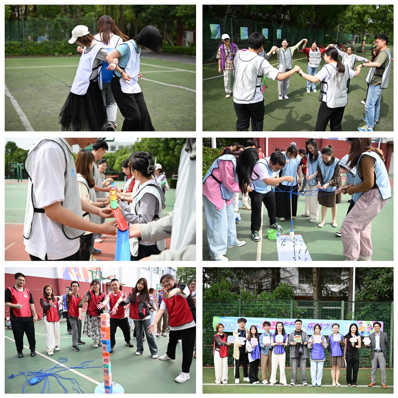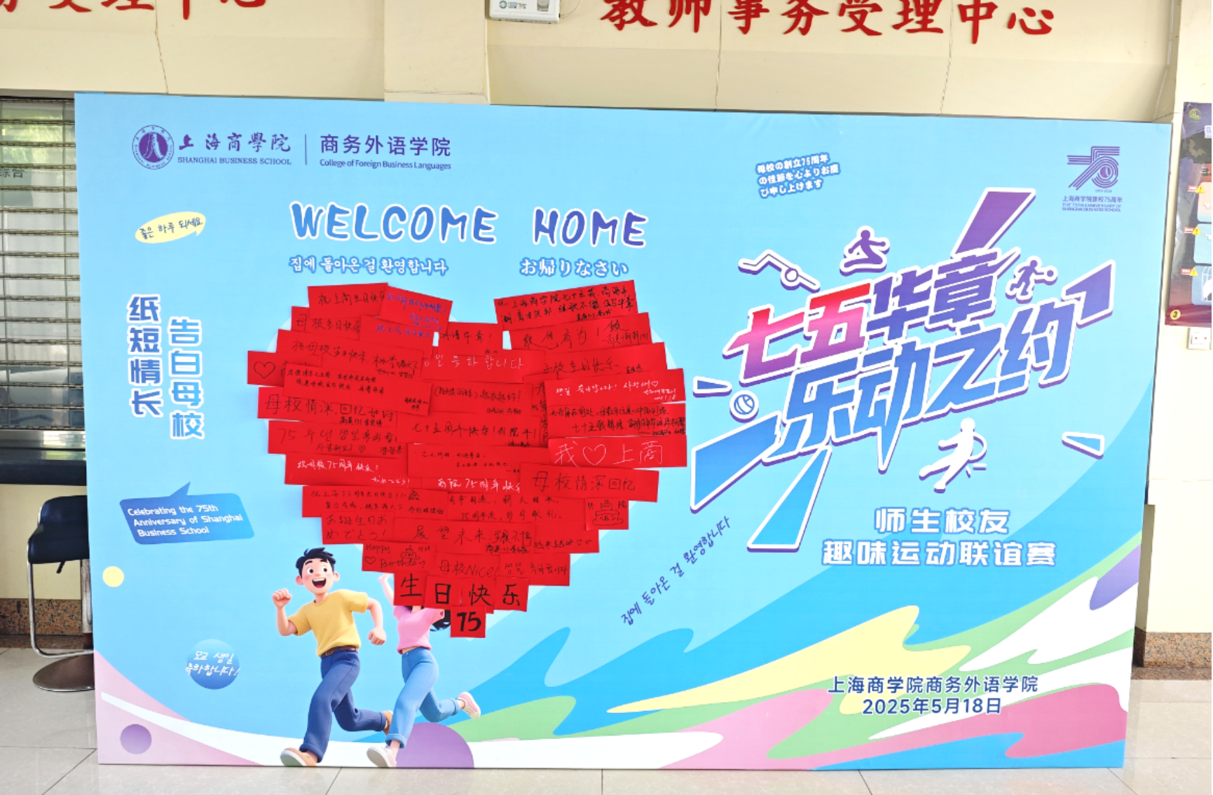 下午,在奉浦校区小足球场,一场别开生面的师生校友趣味运动联谊赛火热开赛。参赛师生校友们分成五队,身着统一队服,精神抖擞地投入背夹球、合力筑塔、珠行万里等趣味项目,赛场上,队员们默契配合、奋力拼搏,现场呐喊声此起彼伏。“我爱上商祝福语DIY”特色环节中,大家运用自己所学英语、日语、朝鲜语,用画笔自由创作,在卡片上勾勒校园记忆、书写对母校的真挚祝福。活动最后,学院为获奖队伍颁奖。这场充满活力与温情的联谊赛,不仅充分展现了师生校友间深厚的情谊与强大的团队精神,更以欢声笑语、满满心意,为建校 75 周年献上了最温暖真挚的祝福。