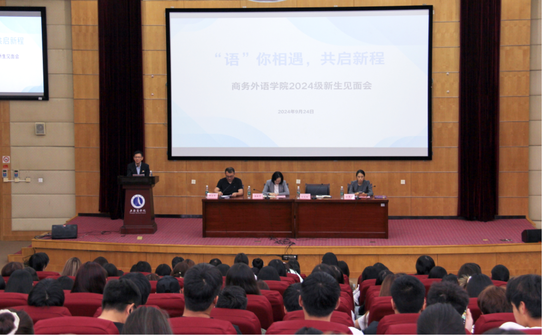 9月24日下午,商务外语学院在2号楼130报告厅召开“语”你相遇,共启新程——2024级新生见面会。商务外语学院党总支书记余绘平、党总支副书记、院长段俊晖、党总支副书记、副院长胡安华、副院长白莲花、各系主任、副主任、教师代表、新生辅导员及2024级全体新生参加了见面会。会议由胡安华主持。