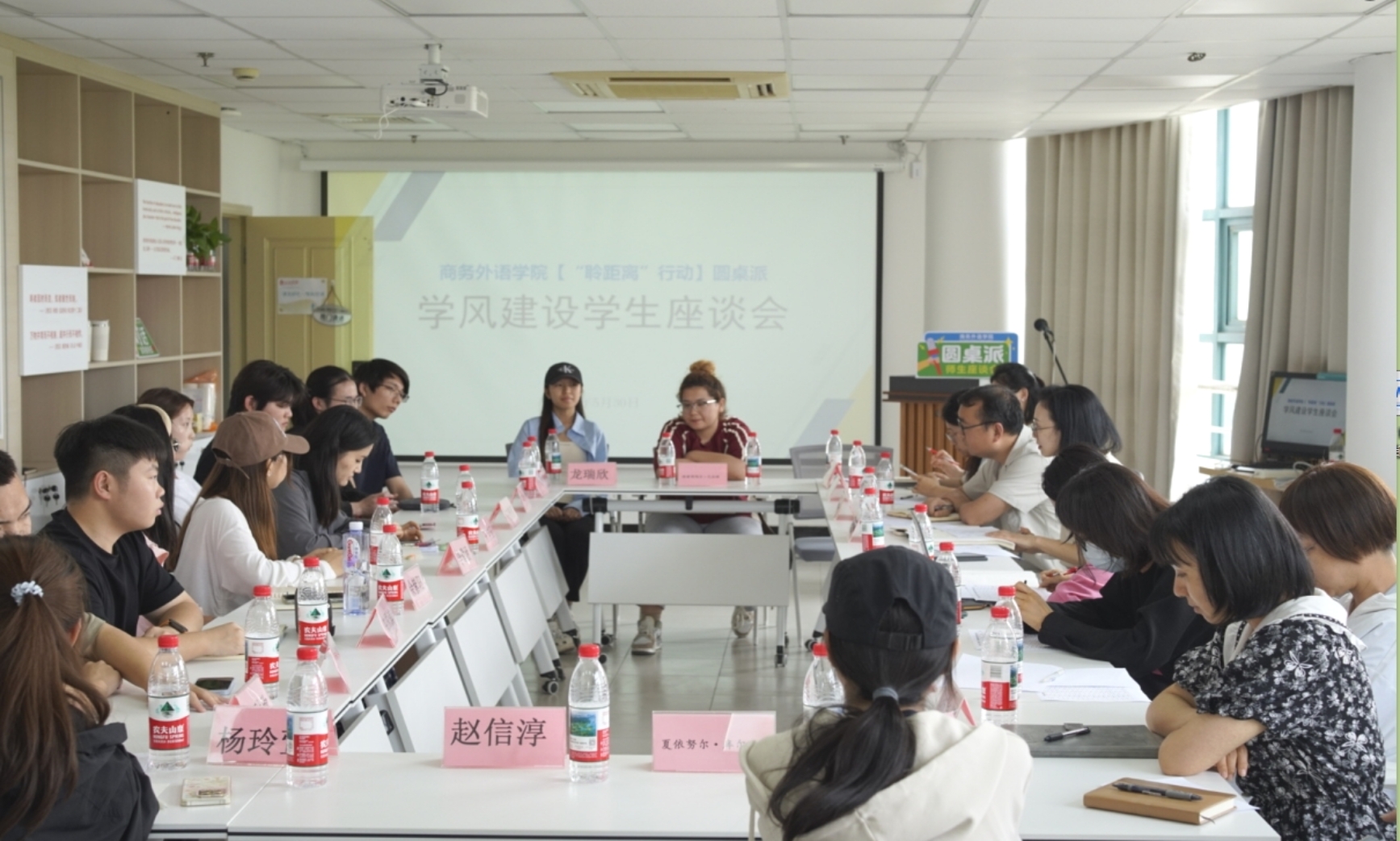 为推进本科教育教学审核评估工作走深走实,切实加强学院学风建设,进一步提升人才培养质量,5月30日下午,商务外语学院在行政楼407会议室召开“聆距离”行动之圆桌派学风建设学生座谈会。商务外语学院领导班子成员、专业师生代表参加会议。会议由学院党总支副书记、副院长胡安华主持。