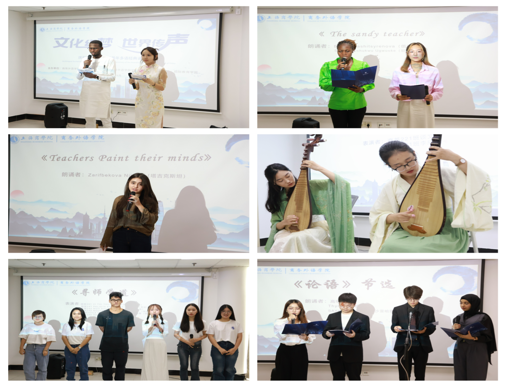 朝鲜语系教师崔海燕和朝鲜语231班王依芸用中朝双语演绎经典《春江花月夜》,在悠扬韵律与深邃意境的交融中,让外国友人得以领略中国古典诗词的瑰丽,实现跨文化的审美共鸣。越南籍留学生阮香江、老挝籍吴芳灵等带来中文表演《寻师求道》,展现中国文学作品经典人物形象,让我们感受到东南亚学子对中华文化最质朴的热爱。来自哈萨克斯坦的沙亚哈提・阿勒哈尔、摩洛哥的艾美、柬埔寨的谢碧娜和商务英语221班高明泽共同诵读《论语》节选,引领我们穿越千年智慧长廊,汲取生活的智慧与哲理。