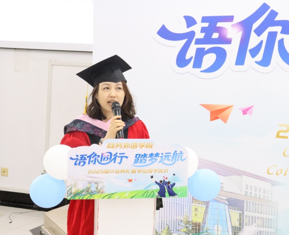 日语专业教师金燕玲代表老师发言。她用深情有力话语,为毕业生们传递力量与希望,希望毕业生们要做善良真诚的人,不被世界的复杂和生活的压力所改变,用善良和真诚去对待每一个人、每一件事,收获信任与美好;做一个坚韧不拔的人,勇敢面对生活中的压力、困扰与打击,将挫折视为成长的契机,用坚韧毅力实现人生价值。最后,她以“善良是温暖的光芒,坚韧是成功的基石,思考是创新的源泉”与同学们共勉,并发挥外语专业特长,用多种语言送上毕业祝福,赢得全场热烈掌声。。