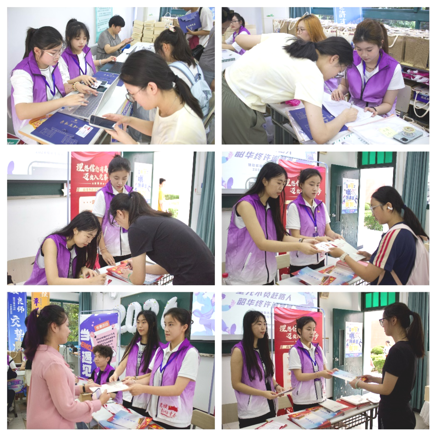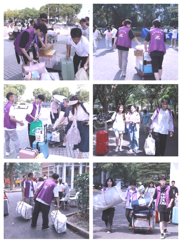 为了让新生更好地融入、适应大学校园生活,学院自暑假期间积极筹备迎新工作,院团委开展了迎新学长培训、新生信息对接工作,学院新生辅导员在暑期提前联系新同学,了解学生基本情况,确认报到相关事宜,让新生提前感受学院的关怀和温暖,为迎新工作的顺利开展做好了保障。迎新当天,对接学长、学生党员、入党积极分子等志愿者早已在校门口、图文信息楼前、报到教室、宿舍门口完成准备工作,他们分工明确,主动热情地帮新生搬运行李,耐心解答新生和家长的问题,用实际行动引导新生迈入新校园,为新生入学第一站保驾护航。在报到教室,志愿者引导新生有序排队登记,认真清点报到所需材料,为新生办理入学手续,发放新生礼包,帮助新生顺利完成报到,指引新生购买教材、军训服、生活用品等等。