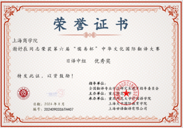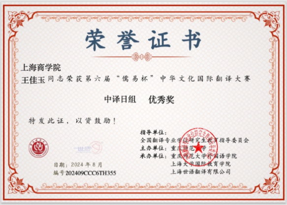 近日,备受瞩目的第六届“儒易杯”中华文化国际翻译大赛圆满结束。商务外语学院日语系学生谢妤辰、王佳玉在本次大赛中表现卓越,凭借扎实的语言基础和出色的翻译能力,分别斩获中译日组和日译中组的优秀奖,为学校赢得了赞誉。