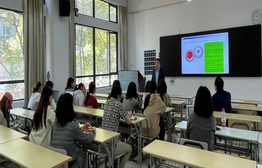5月14日,复旦大学外文学院朝鲜语系主任郭一诚副教授应邀为我校朝鲜语专业的师生带来了题为“中韩建交三十周年回顾与展望”的专题讲座,讲座由我校朝鲜语系副教授申美花老师主持。郭一诚老师主要研究方向为中韩词汇对比、中韩语法化对比等,出版专著《中韩感觉形容词对比研究》,主编及参编教材6部,在国内外学术期刊发表论文10余篇。现兼任中国韩国(朝鲜)语教育研究学会副会长、韩国国语学会海外理事、韩国国语国文学会国际理事、期刊《中韩语言文化研究》、《韩国学研究》编委等学术兼职。