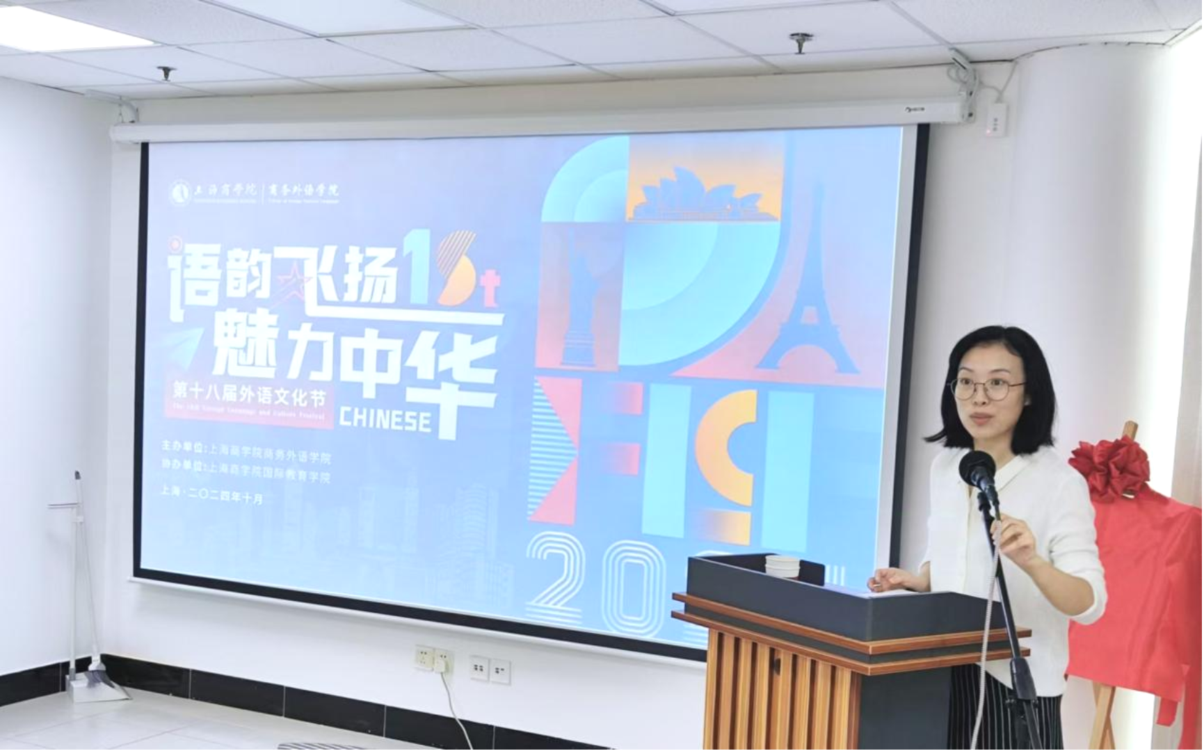 学院党总支书记余绘平在开幕式致辞中指出,外语文化节作为学院校园文化建设的品牌活动,是中外文化交流互鉴的重要平台,是拓宽师生国际化视野和跨文化交际能力的重要载体。她强调,面对人工智能时代的挑战与机遇,商务外语学院师生更应主动承担起中外人文交流的使命,积极参与到本次外语文化节丰富多彩的活动中来,充分利用外语语言优势,传播中国声音,向世界讲述中国故事,推动中华文化更好走向世界。随后,她宣布商务外语学院“语韵飞扬,魅力中华”第十八届外语文化节正式开幕,并预祝本届外语文化节取得圆满成功。