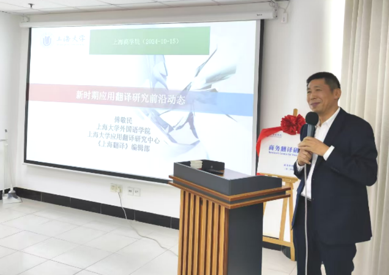 为营造良好的外语学习氛围,提升学生语言实践与文化交流能力,商务外语学院“语韵飞扬,魅力中华”第十八届外语文化节开幕暨商务翻译研究中心揭牌仪式于10月15日下午在行政楼407会议室举行。活动特邀商务外语学院前任院长、上海大学外国语学院教授、博士生导师、《上海翻译》主编傅敬民教授参与揭牌,并作“新时期应用翻译研究前沿动态”专题讲座。会议由党总支副书记、院长段俊晖主持,学院领导班子成员、全体教职工及学生代表参加会议。