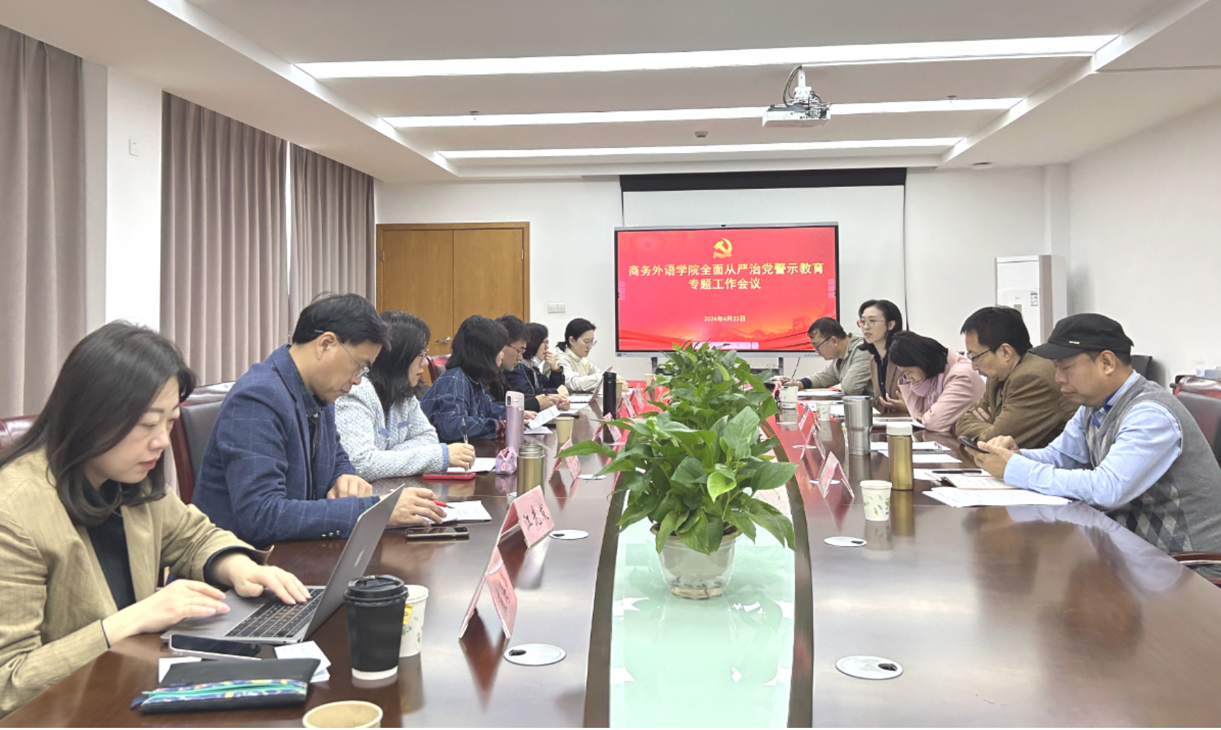 4月23日上午,商务外语学院在徐汇校区1502召开2024年度全面从严治党警示教育专题工作会议党总支会议。学院党总支委员、各支部书记以及各系部主任参加会议。会议由学院党总支副书记(主持工作)余绘平主持。