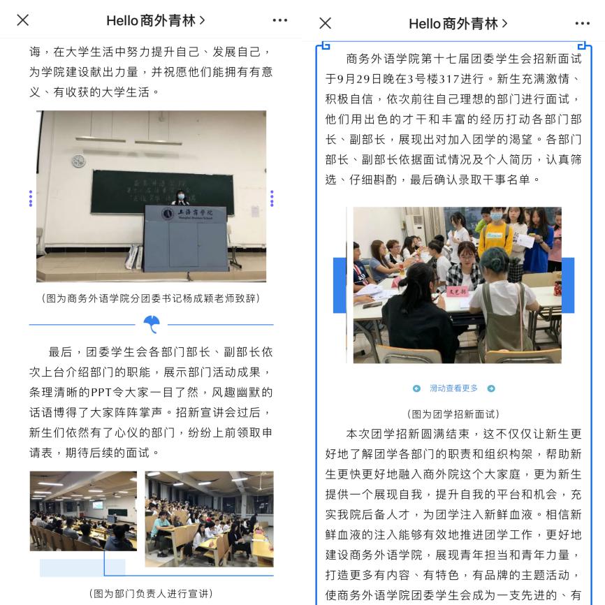 萌新破冰展风采,团学招新迎新锐。学院举办2020级新生破冰班会,师生们风趣幽默的自我介绍不仅展现出每个人独特的风采,还加深了彼此的了解;在班级学长助理的帮助下,2020级各班顺利选举出班委会,班委成员们纷纷表示将尽快熟悉工作,带领班集体乘风破浪、砥砺前行。此外,学院团委学生会开展“正值芳华,“语”你相遇”团学招新宣讲会,分团委副书记钱雨婷介绍团学在过去一年中的活动成果以及各部门职能,号召大家要牢记习总书记“青春由磨砺而出彩,人生因奋斗而升华”的嘱托,积极加入团学,在大学生活中努力提升自己、发展自己,为学校和学院建设献出力量。宣讲会结束后,新生们摩拳擦掌、信心满满,依次前往自己理想的部门进行面试,争取在学院团学这支青年先锋队中发光发热,展现青年担当和青年力量。